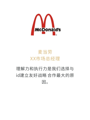 i-d先后經(jīng)歷與Audi、Mercedes-Benz、infiniti、PORSCHE、可口可樂、麥當勞、肯德基、Budweiser、華為、小米、中國移動、ELLE、L'OREAL、萬達、仁恒置地、恒大、碧桂園、蘭桂坊...的業(yè)務(wù)合作,成功地將國際化的營銷策劃理念及執(zhí)行方式融入本土,為更多的中國企業(yè)開啟全新的品牌推廣思路和執(zhí)行方案。